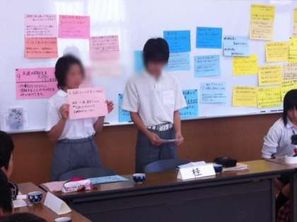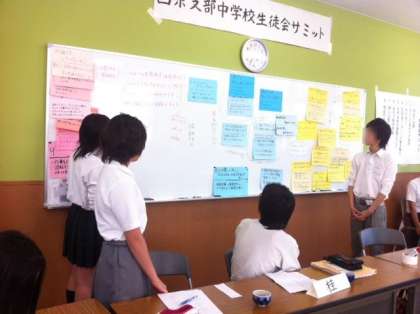 7/10(火)午後4時〜本校会議室で西京区8中学校の生徒会代表16名が集まり、それぞれの学校の良いところや課題などを全校アンケートの結果をもとに発表する活動を行いました。またそののち、各学校の取組方法を皆で知恵を出し合い討議活動も行いました。