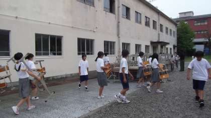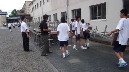 9/14(金)午後から激しい雨となりましたが、現在は雨も止んでいます。火曜日に業者さんが古くなって使えなくなった生徒の机といすを引き取りに来られますが、それに先だって倉庫にしまってあった机いすを屋外に搬出する活動を予定していました。ところが、土砂降り・・・どうしよう・・・しかし神様が日頃の努力に応えてくれたのか、搬出作業が始まるころには雨もあがりました。しかしもう1つ難題が・・・。たくさんの数の机いすを2階の倉庫から1階に運ぶだけでも大変です。まあ教職員でコツコツやるしかないなと思っていたところへ、次々と生徒がやってきて、あれよあれよと言う間に運んでくれるではありませんか。1時間はかかると考えていた作業がわずか20分で終了。これはひとえにボランティアで手伝ってくれた生徒のおかげです。