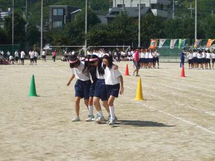 1年生〜3年生女子による四人五脚です。息を合わせるのが大変むずかしい・・・。なかなかうまくいきません、でも最後までがんばれ〜
