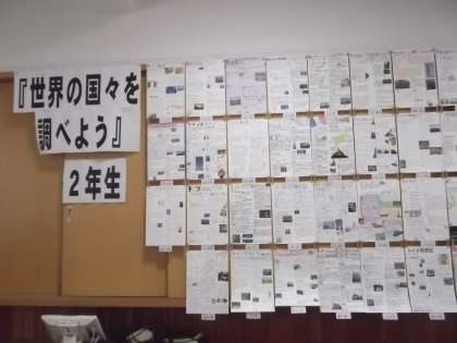 1年生歴史新聞、2年生世界の国々の調査を画用紙にまとめました。