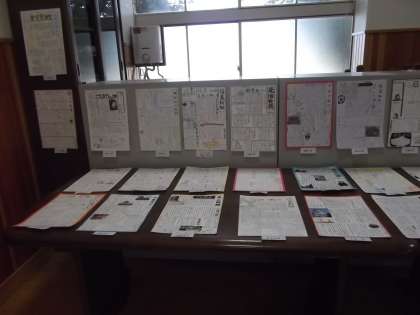 2号館(一番西の物集女街道側の校舎)1階ランチルームでは社会科の夏休み課題の作品展を行っています。