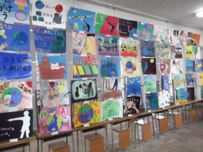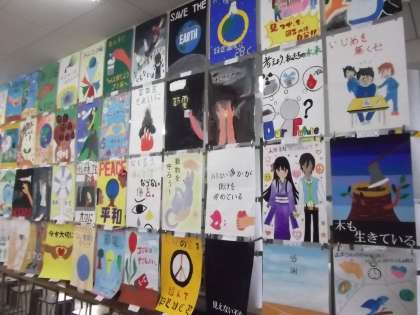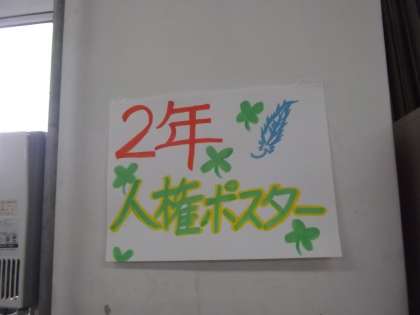 1年生と同じ第1美術室では2年生の「人権に関するポスター」作品の展示が行われています。どれも力作です。
