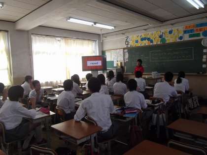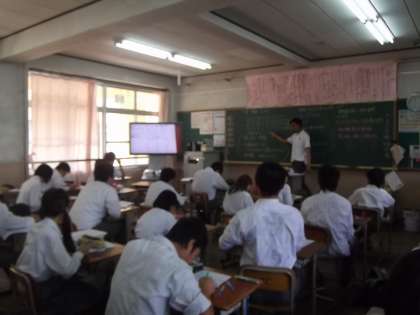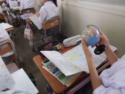 3限中の教室を各学年歩いてみました。1年生では地理的分野の世界地理を学習しており、2人に1個分配されたミニ地球儀と地図帳を使いながら、世界地図図法の学習をしていました。教科担当の先生の発問にいろいろな意見がとびかってなかなか面白かったです。