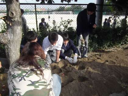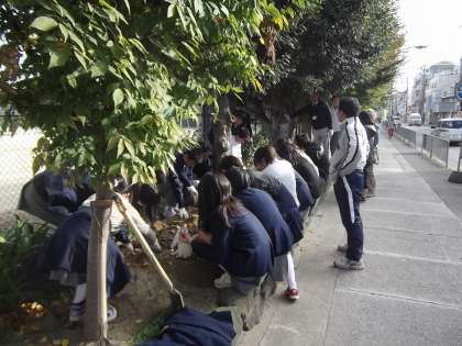 本校西側物集女街道に面したグリーンベルトで、チューリップの球根を植え付けました。