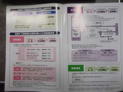 2/13(水)、本日付で1・2年生のすべての生徒さんを通して、平成26年度からの公立高校入学者選抜にかかる新しい教育制度についてのリーフレット(写真にあるとおり)を配布いたしました。