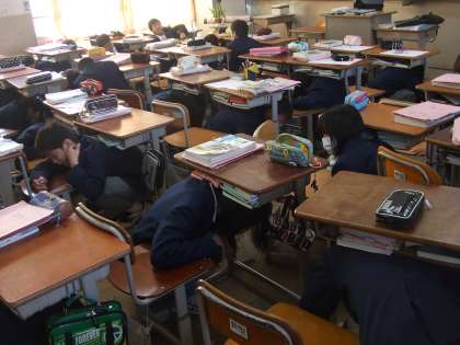 中学生が姿勢を低く、頭や身体を守る、揺れがおさまるまでじっとするの3つの安全行動に対して、本当にできるのかと少し心配な点がありましたが、ほとんどの生徒が実際に机の中に頭を隠し、約1分間の黙祷にも心静かに参加していました。(3年生は校外学習のため学校は不在です)