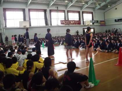 そののち生徒会代表激励の言葉、校長先生激励の言葉、生徒会本部役員10名によるエールが送られたあと、サプライズで家庭科部や美術部など文化系の生徒が制作した「大うちわ」が登場し、陸上部女子キャプテンがそれを受け取り、会場に風を送ってくれました。