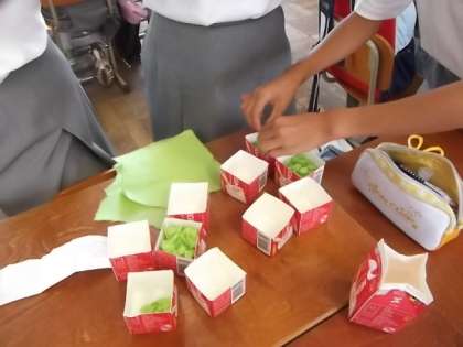 今日は1年生の展示で「貼り絵」の様子をご紹介します。色和紙を小指の爪よりも細かく刻んだものをのりで丁寧に貼り付けていく作業は根気と時間が必要です。テーマは京都の身近な風景・・・この時間の活動はとにかく和紙を細かく色事に牛乳パックの仕分け箱に入れていく活動が班ごとに行われています。