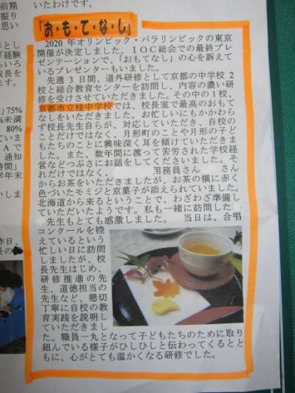 さて、先月北海道月形中学校の先生お二人が道徳教育を中心に学校視察に来られたことはこのHPでお伝えしましたが、お礼状が届きました。丁寧なお礼状とともに、月形中学校の通信に「桂中学校でのおもてなし」について記事にしていただいたことも知らせていただきました。わたしたちがお互いに学び合った道徳教育とともに、「桂中学校で受けたおもてなしの心に感動した」と書いていただきました。視察の内容について、十分なことができなかったかも知れないという思いがあったため、逆に大変うれしいことです。通信の一部を掲載させていただきます。今後も北海道の学校と交流を続けていきたいと思います。(さ)