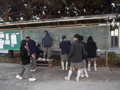 さて,今朝生徒会本部役員10名が早朝より登校して,生徒会黒板の更新を行ってくれました。(写真参照)。今回は進路決定を目前に控えた3年生に贈るメッセージ集となっています。10名の本部役員がそれぞれ各自で考えてくるのですが,何故か大人気漫画「黒子のバスケ」からの引用が重なっていることに,時代を反映していることが面白いです。