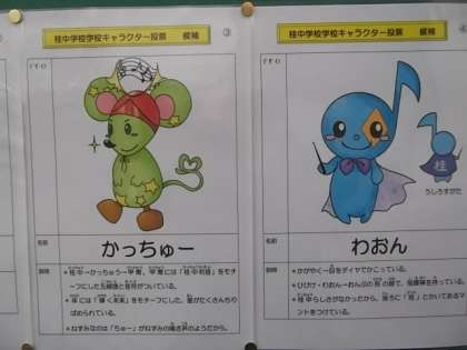 本校3号館校舎東側壁面に学校スローガン『輝く未来は無限大〜響け!!桂中和音〜』の懸垂幕が掲げられてからもうすぐ1年が経過します。現2・3年生はこの学校スローガン作成に直接関わっていたので,思い入れも強いと思われますが,現1年生やこれから入学してくる生徒たちにも親しんでもらうため,この学校スローガンをモチーフにした桂中学校・学校キャラクターを制作することになったことはすでにこのHPでお伝えしてきました。生徒会文化委員会が中心となり,全校から募集したオリジナル・未発表のアイデアを6点に絞り込みそれらが発表されました。それぞれの作品にはきちんとイメージの説明文が書かれていて,時間をかけて一生懸命作成してくれたことがうかがえます。