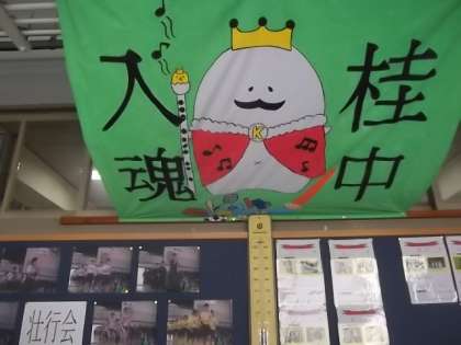 実は・・・この旗は春体開会式に向けて美術部が製作してくれ,西京極陸上競技場の桂中学校選手団の一角でお披露目されるはずだったのが,開会式が雨天中止となり日の目を見ることができなかったものです。やっと晴れ舞台がやってきました。(さ)