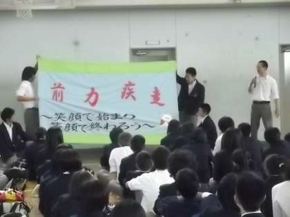 6限目は学年集会で係りの生徒が団旗を披露してくれました。