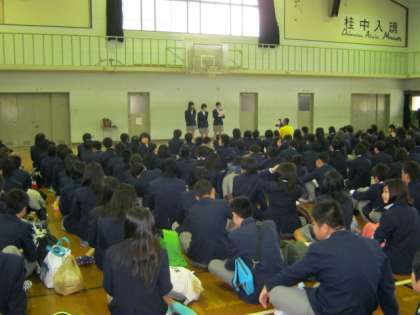 7:10 予定通り結団式が始まりました。校長先生や修学旅行実行委員長のあいさつ,諸注意,添乗員さん写真屋さんの紹介など,ワクワク感と緊張感の入り混じった雰囲気の中で進んでいきました。