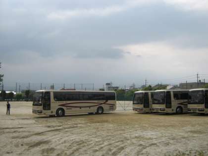 7:45 大きな荷物は先に送っていますので,身軽ないでたちでバスに乗り込みさあ出発です。欠席者もなく車内から笑顔で手を振りながら西門を出ていきました。