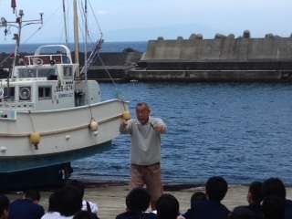 漁船の前で釣りの説明を聞いているところです。