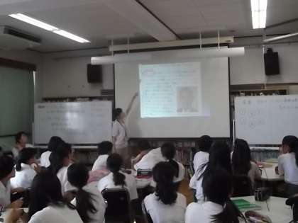 さて,本校の図書館教育「図書館の活用」で,ここ1週間ほど1年生国語科授業が図書館で行われています。授業者は国語科担当教員と図書館司書教諭2名のティームティーチングの形成で行っています。