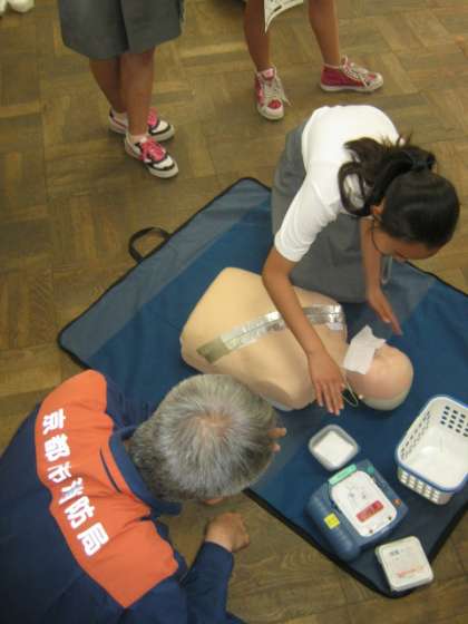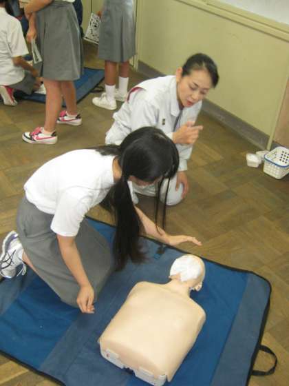 消防署より救命救急士さんなど5名の方に来ていただき,各教室で実技講習が始まりました。ダミー人形等を使って実際に人が倒れている場面を想定し,反応を確かめたり,大きな声で助けを呼んだり,声を出して30回数えながら胸部圧迫し2回人工呼吸を行う心肺蘇生法を全員が体験しました。