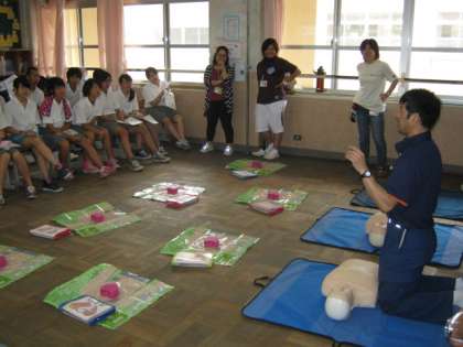 多人数で実習するため,ダミー人形だけでなく,人物を描いたビニールシートの上にハート型をした模型を置いて胸骨圧迫の練習をします。小さい子ども靴で歩くと「キュッ!キュッ!」と音のする,あんな感じで圧迫するたびに音がでます。