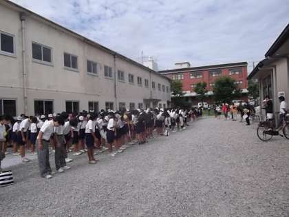 朝から強い日差しが照りつけとても蒸し暑い中,草引き,手洗い場みがき,屋外トイレ清掃,ごみ拾いなどなどを部活動・係ごとに分かれて10時まで精一杯がんばりました。改めてうれしかったと感じたことは,指揮の先生がお話しされたら,集団が「おはようございます」とか「はい」とか「ありがとうございました」とかを大きな声で返事ができるようになってきたことです。教職員の日々の指導が積み重なって,学校全体がまた一歩前進しているように感じることができました。(さ)