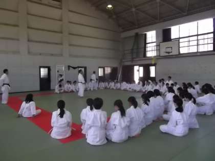 けさ固めから逃れるための方法を皆で練習しています。もちろん,男女共修です。(さ)