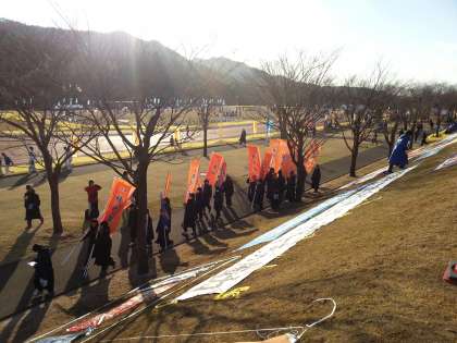 全国から集まった各校応援団が横断幕やのぼりの準備をする中,我が桂中応援団も負けてはいません。