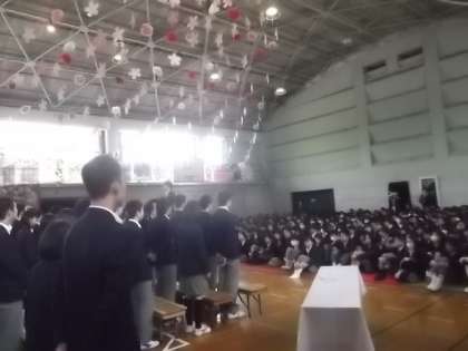 最後は3年生からのお返し発表,心のこもった熱いメッセージのあと卒業式でも歌う「旅立ちの日に」を1・2年生に返歌として歌いました。