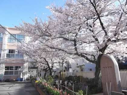 昨日は終日雨模様で桜がほんの少し散っていましたが,今日は満開です。(さ)