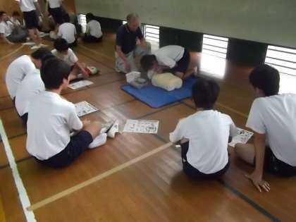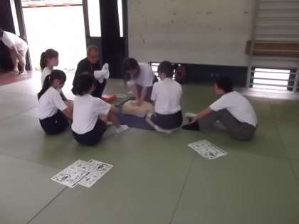 などの手順と実際に人形を使って心臓蘇生法の講習を受けました。
