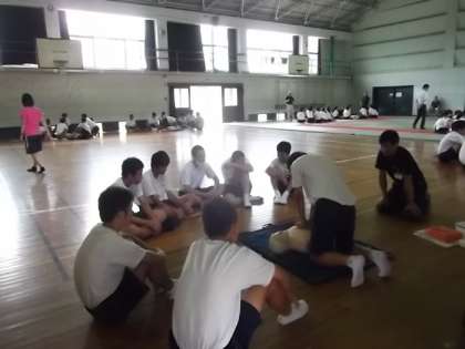 3年生はすでにお伝えしている救命救急講習の最後の2クラスが体育館で授業を行っていました。これで3年生全員が講習を受講しました。修了証もいただきました。(さ)