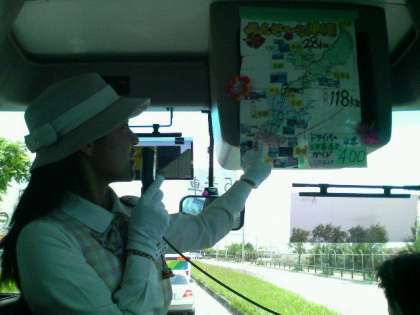 バスは本部港に向かって沖縄本島を北上しています。現在途中で中城(なかぐすく)PAでトイレ休憩をしています。あと1時間ほどで港に着きます。