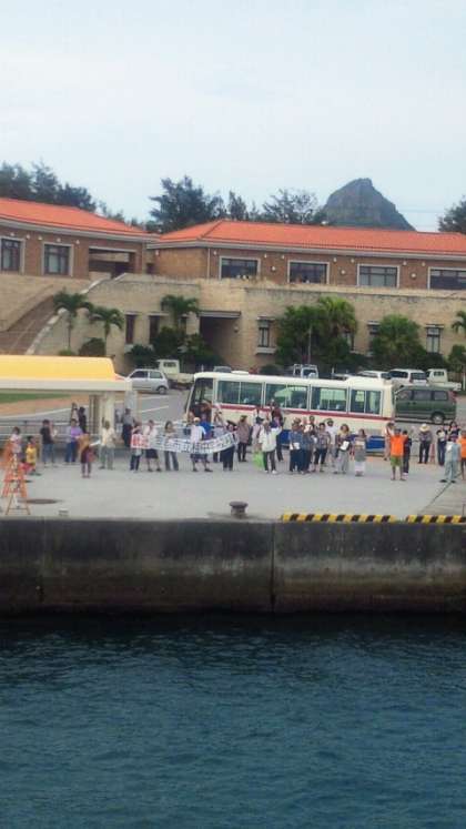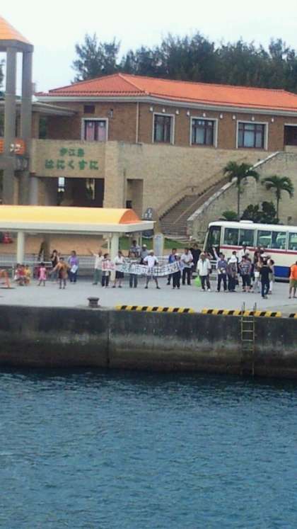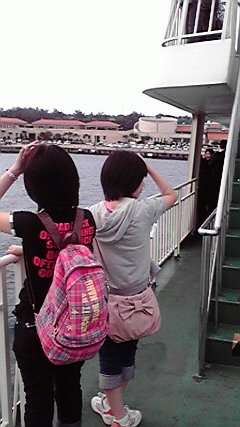 17:30伊江島に到着しました。 「全員元気だ」と連絡が入っています。 写真でおわかりのとおり、お世話になる民家の方々が港に出迎えに来ていただきました。さあ、これからが今回の修学旅行の第1の目的、お世話になるご家庭の方々と言葉を交わし、食事を共にし、明日は様々な体験活動をすることで、たくさんの思い出づくりや学習ができることと思います。 さて、本日のHPの更新はここまでとさせていただきます。300件を超えるアクセスをいただきありがとうございました。明日は午前9時半ごろから随時更新をしていきます。