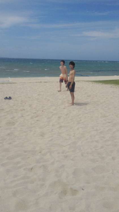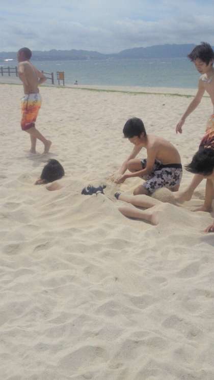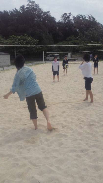 ビーチバレーも始まったようです。写真ではご紹介できませんが、水着を持って来なかった男子生徒数名はとうとう我慢しきれずに、服のまま海に飛び込んだようです。でも大丈夫、伊江島は完全に夏ですからすぐに乾きます。
