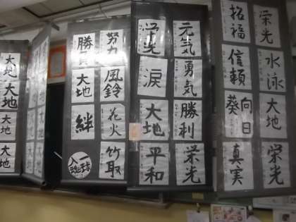 3号館2階1年2組の教室では,国語科の展示が行われています。習字や短歌,人物新聞などの作品がいっぱいです。(さ)