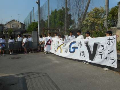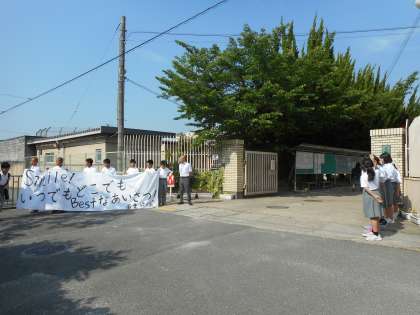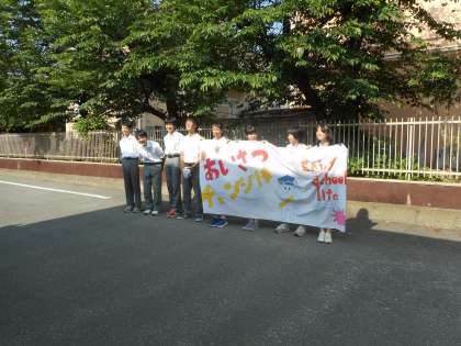 校門付近で3カ所に学年ごとに分かれて、それぞれが横断幕を