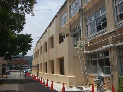 昨年秋以降、本校は1号館の取り壊し、2号館3号館4号館の耐震工事と大規模な工事が続いていましたが、ようやく耐震工事も完成間近となりました。耐震工事が終わると今度は旧1号館跡地に平屋のプレハブ校舎が建設されます。ちょうど夏休み中に工事が終わり、休み明けには使用できると思われます。1号館の取り壊しから長い間生徒の皆さんには不自由をかけました。さらに、とりわけ学校周辺の住民の皆様には長期間大変ご迷惑をおかけいたしました。プレハブ校舎完成まであとひと月あまりさらにご迷惑をおかけすることと思いますが何卒ご理解とご協力をお願いいたします。