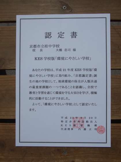 本校は平成21年度「KES学校版『環境にやさしい学校』」に認定され、本日認定書をいただきました。今後もゴミの分別・減量化をはじめ全校で教育と学習を通して環境を守る大切さを学び、また活動してまいります。