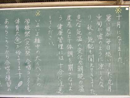 先月からこのホームページに掲載するようになった「今月の校長先生の言葉」です。(校門を入ったすぐの左手に掲示板があり、毎月1日に校長先生が今月の言葉を書かれておられます。)10月の校長先生の言葉です。