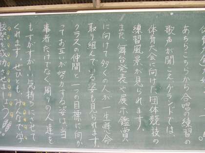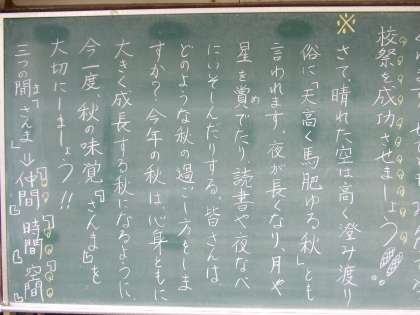 あちらこちらから合唱の練習の歌声が聞こえ、また、グランドでは体育祭に向けた団体競技などの練習の風景が見られます。クラスの仲間と一つの目標に向かってお互いが努力する姿は、当事者だけでなく、周りの人たちもすがすがしい気持ちにさせてくれます。是非ともみんなで学校祭を成功させましょう!