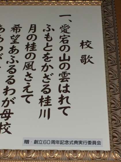 10/5(火)いよいよ桂中学校学校祭が始まりました。今日は午前中学校で合唱コンクールの最後の仕上げを行い、現在長岡京記念文化会館で合唱コンクール中です。今頃審査結果発表の頃だと思います。合唱コンの様子や結果はこのあと随時HP上にアップしていきます。今回はまず、校門の看板と体育館に飾ってある「桂中学校校歌」の額(一昨年度創立60周年記念事業で寄贈いただいたものです。)を掲載してこれからしばらく学校祭特集をお届けするオープニングとさせていただきます。合唱コン・展示発表・舞台発表・体育大会どんどんアップしていきますので、お楽しみに!!