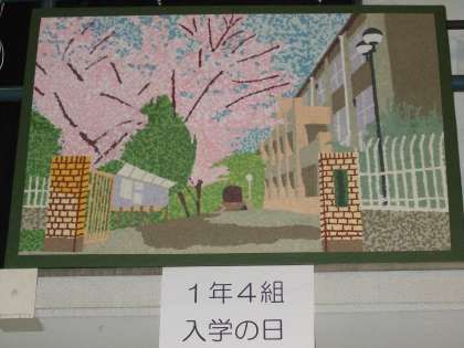 舞台発表会場の第1体育館壁面に1年生がクラス単位で制作した「貼り絵」が展示されています。撮影角度が下からになっていますので少しお目苦しいですが、丁寧に一人一人が心を込めて作った力作をご覧下さい。