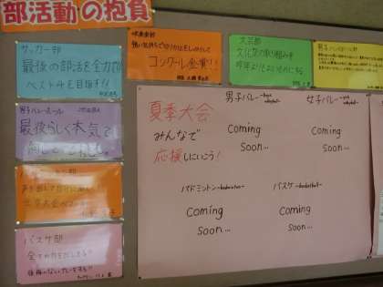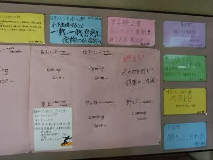 今年度、生徒会企画として「夏季大会応援推進活動」を実施しています。この活動は夏季大会を学校全体で応援し、盛り上げていこうという企画です。その一貫として、グラウンド側出入口に部活動の夏季大会やコンクールに向けての抱負と各部活動の夏季大会日程アピールポスターを作成しているところです。写真で様子をご紹介します。皆さんの力強い応援をよろしくお願いいたします。