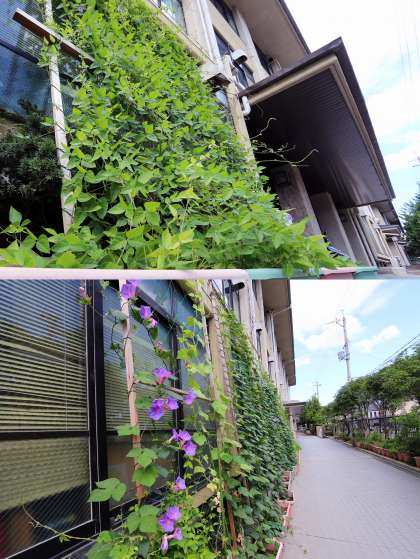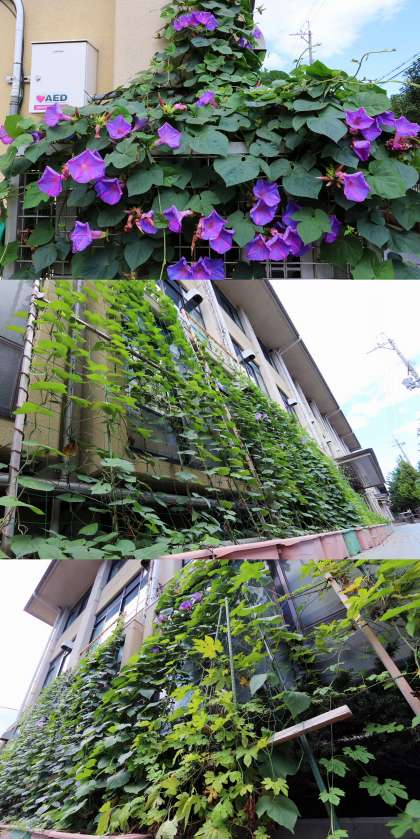 南校舎の南側で、環境美化委員会が育てている「みどりのカーテン」が成長してきました。