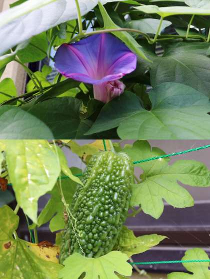 朝顔(オーシャンブルー)が咲き、ゴーヤの実が大きくなってきました。