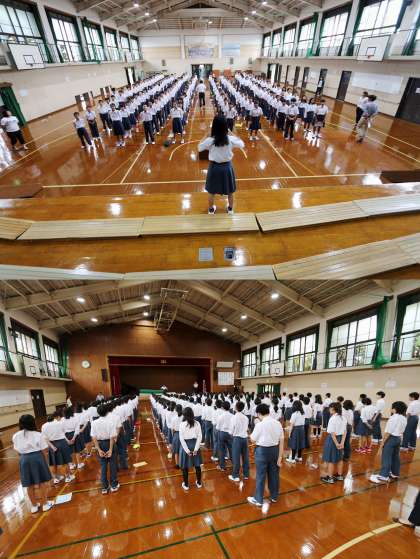 1年生は校歌と全体合唱の練習後、ステージにクラス発表順に上がり、現在の出来具合を披露しました。他のクラスの発表を聴き、お互いに良い刺激を受けていました。