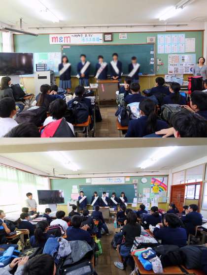 終学活時に、立候補者が4グループに分かれて各教室を回り、呼びかけを行いました。今日は1年生の教室を回りました。