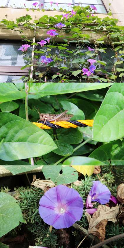 校庭の木々は色づいてきましたが、南校舎南側で「アサガオ」は頑張って咲いています。