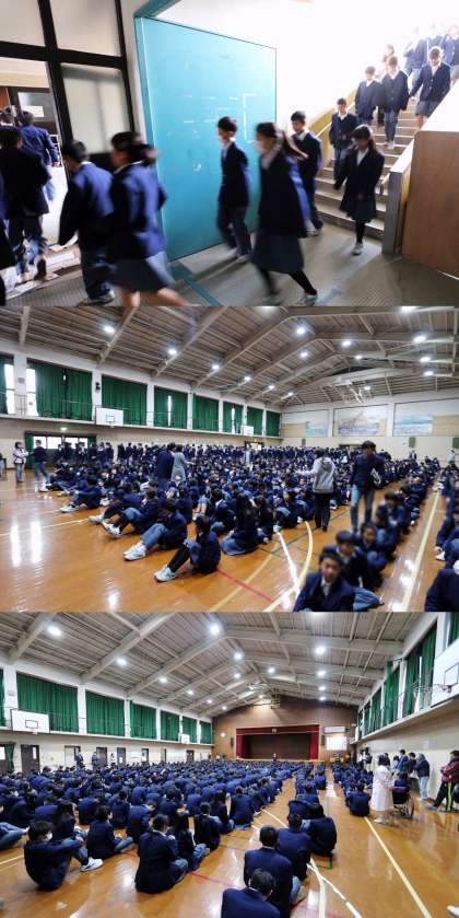 1月17日の「防災とボランティアの日」(阪神・淡路大震災が起こった日)を前に、本日6限、避難訓練を行いました。今回は地震が発生したことを想定し、被害を最小限にとどめるための避難訓練です。訓練に先立ち,各教室でビデオで地震が起こった時の対処行動について学びました。その後、グランドへ避難する予定でしたが、雨が降りだしたため、急遽体育館に避難先を変更しました。