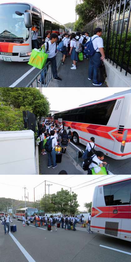 松尾中学校修学旅行一行は、予定より少し早く18時10分過ぎに松尾中学校に帰ってきました。