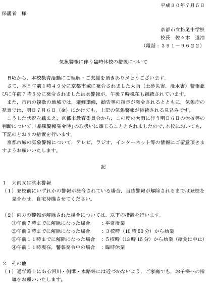 7月5日(木)気象警報に伴う臨時休校の措置について